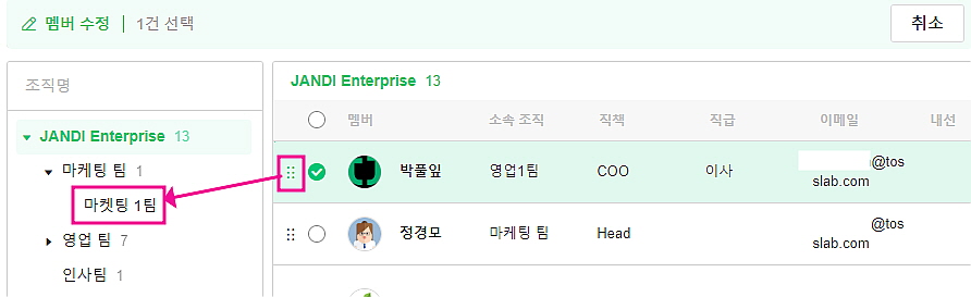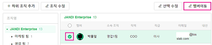- 멤버의 소속 조직 이동 : 이동 원하는 멤버 선택 > [멤버이동] > 원하는 소속 조직으로 Drag & Drop 할 수 있습니다.