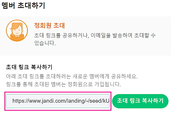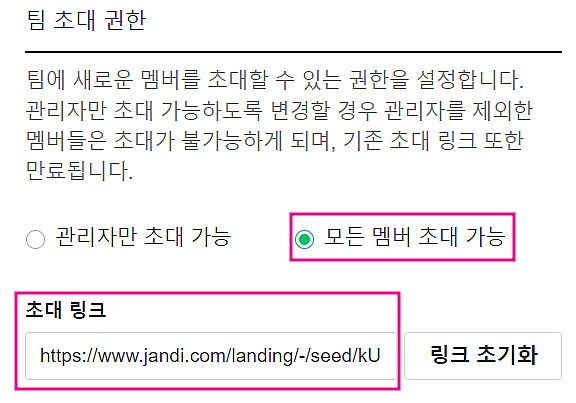 [팀 초대 권한]의 초대 링크는 새로운 멤버를 초대할 때 사용되는 초대 링크와 동일합니다.