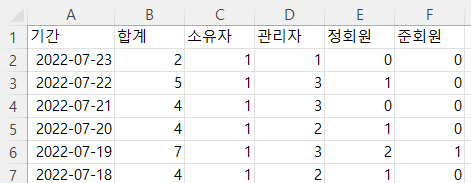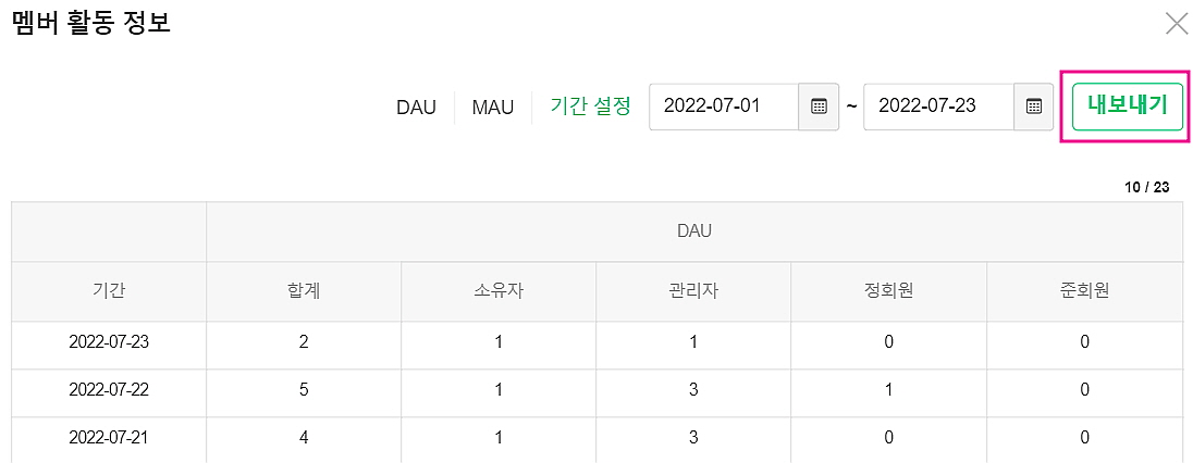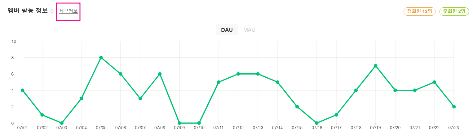 - ‘멤버 활동 정보’ 옆 [세부정보] > 원하는 날짜의 멤버 활동 정보를 조회 및 엑셀로 다운로드 받을 수 있습니다.