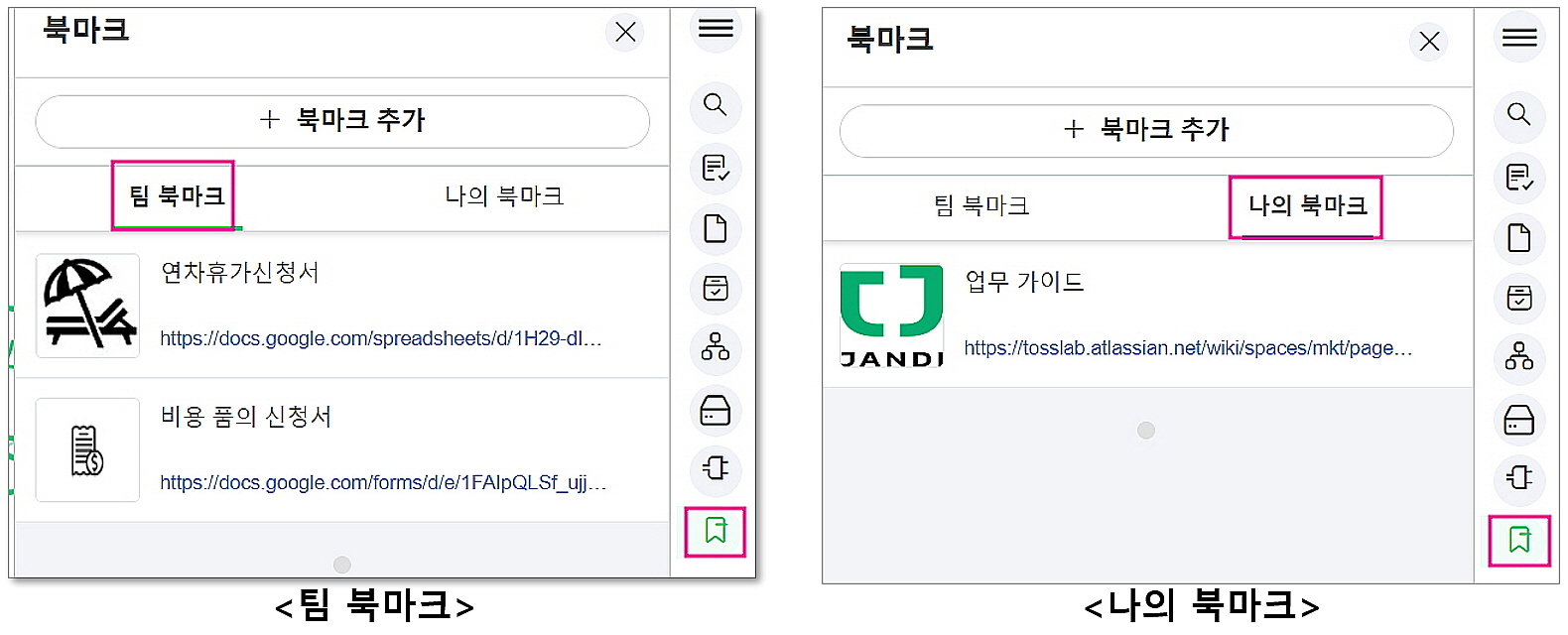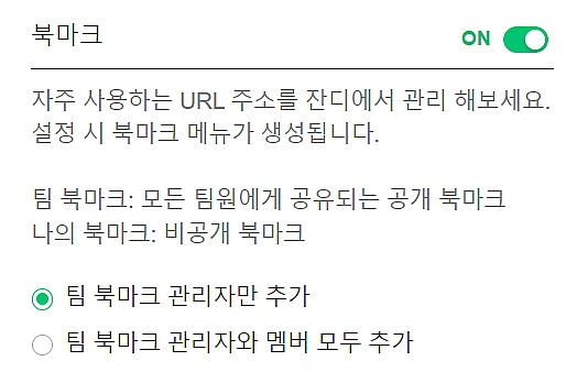 - 팀에서 자주 사용하는 URL 주소를 북마크 기능을 사용하여 멤버들과 [팀 북마크]에 공유하거나 [나의 북마크]도 관리 가능합니다.