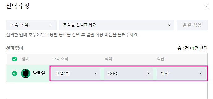 - 멤버의 소속 조직과 직책, 직급 변경 : 멤버 선택 > [선택 수정] > 소속 조직, 직책, 직급 변경이 가능합니다.