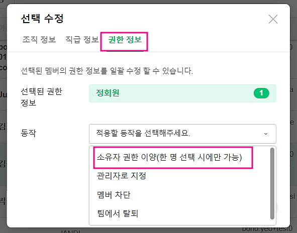 팀내 소유자가 다른 멤버에게 소유자 권한 이양도 [권한 정보]에서 가능합니다.