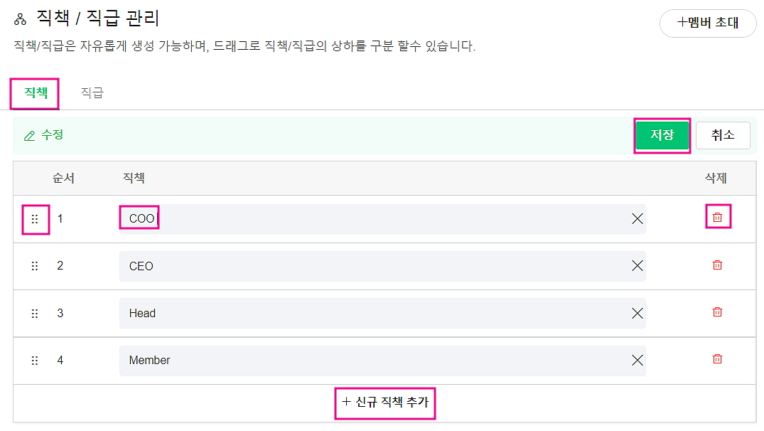 을 누른 후 Drag로 원하는 위치로 이동 가능하고, 이름 수정, 삭제 및 [+ 신규 직책 추가]를 할 수 있습니다.