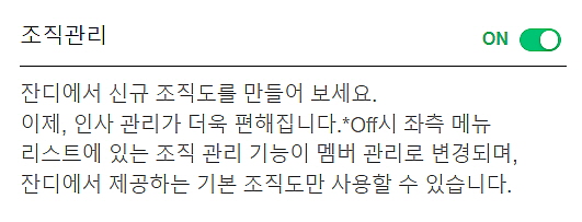 - 팀에서 조직도 기능을 사용 원하신다면 [조직관리] 기능을 On으로 설정 해주셔야 합니다. [조직관리] 기능을 On을 하는 방법은 [부가 기능 설정] 방법에서 자세하게 안내 드리겠습니다.