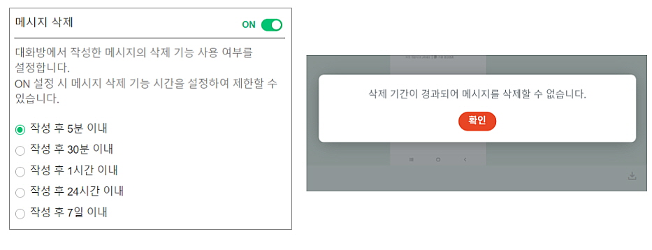 - 메시지 / 파일 삭제 가능 시간을 설정하여서 중요한 업무 자료를 보존할 수 있습니다. [5분~7일] 이내로 설정이 가능하며 지정 기간 이후에는 메시지를 삭제 할 수 없습니다.