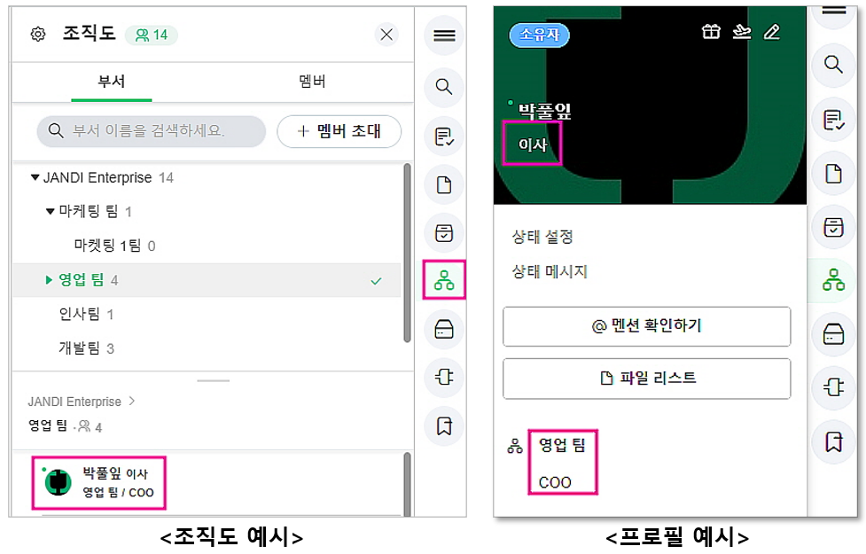 - 직급과 직책을 넣었을 경우 조직도와 프로필에서 위 이미지 예시와 같이 표시됩니다.