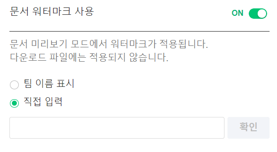 문서 미리보기 모드에서 팀 이름 또는 직접 입력한 문구가 표시되도록 설정할 수 있습니다. 단, 다운로드 파일에서는 적용되지 않습니다.