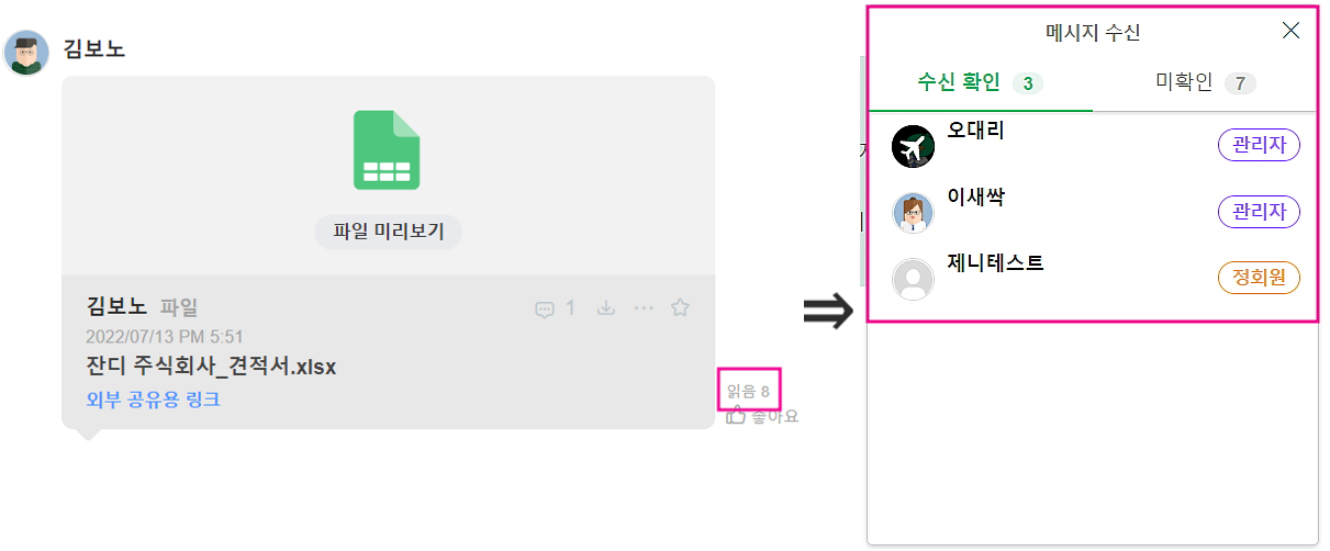 - [모든 메시지 확인하기] : 메시지 옆 ‘읽음’ 선택했을 때 어떤 멤버가 메시지 수신을 확인했고 미확인 했는지 알 수 있습니다.