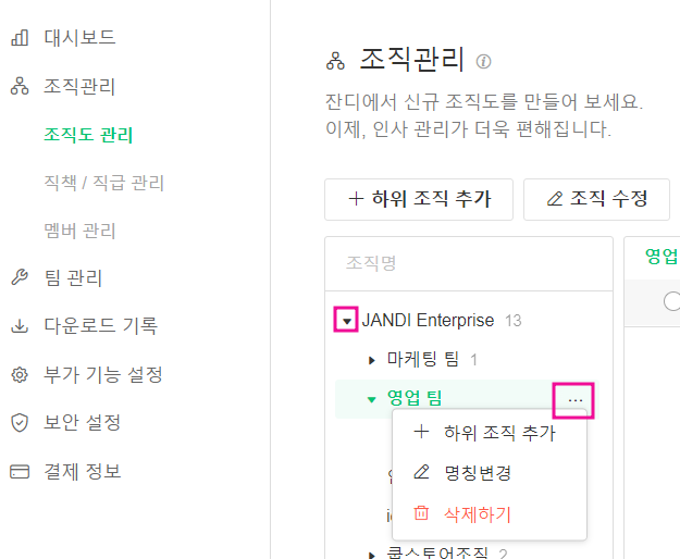 - 추가한 하위 조직은 최상위 조직(JANDI Enterprise) 이름 옆 [▼]를 누르면 확인 가능합니다. 추가한 하위 조직의 […]를 누르면 [하위 조직 추가]하거나 [명칭 변경] 또는 [삭제하기]를 할 수 있습니다.