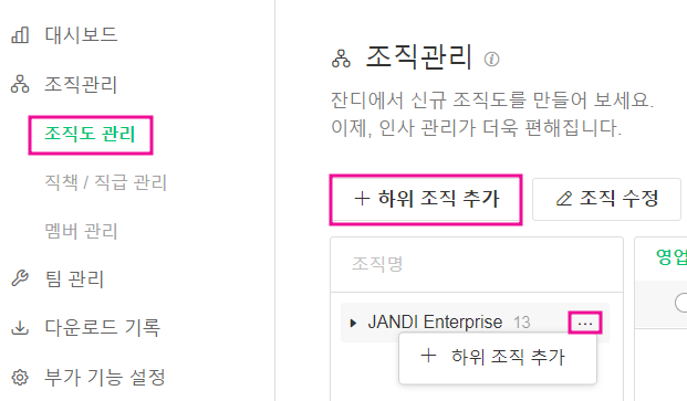 - 하위 조직을 추가 하고 싶으시다면 [+하위 조직 추가]를 선택하여 추가를 하시거나 […]를 누른 후 하위 조직을 추가 해주시면 됩니다.