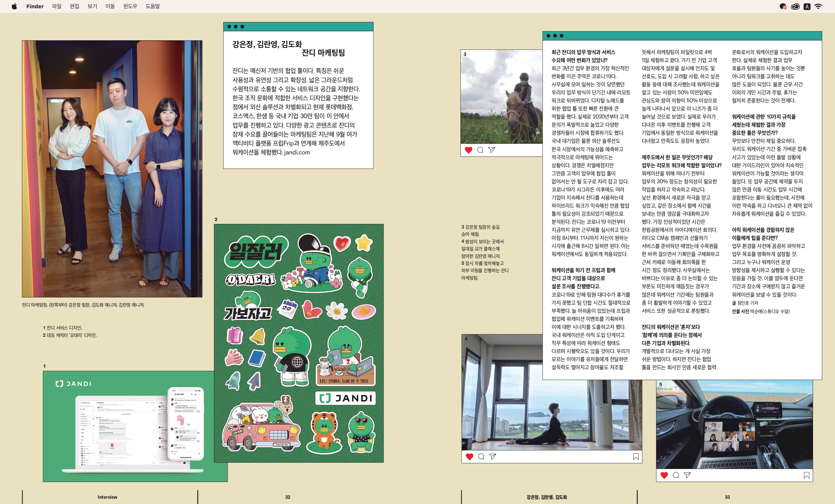 잔디는 메신저 기반의 협업툴이다. 특징은 쉬운 사용성과 유연성 그리고 확장성. 넓은 그라운드처럼 수평적으로 소통할 수 있는 네트워크 공간을 지향한다. 한국 조직 문화에 적합한 서비스 디자인을 구현했다는 점에서 외산 솔루션과 차별화되고 현재 롯데백화점, 코스맥스, 한샘 등 국내 기업 30만 팀이 이 안에서 업무를 진행하고 있다. 다양한 광고 콘텐츠로 잔디의 잠재 수요를 끌어들이는 마케팅팀은 지난해 9월 여가 액티비티 플랫폼 프립Frip과 연계해 제주도에서 워케이션을 체험했다.