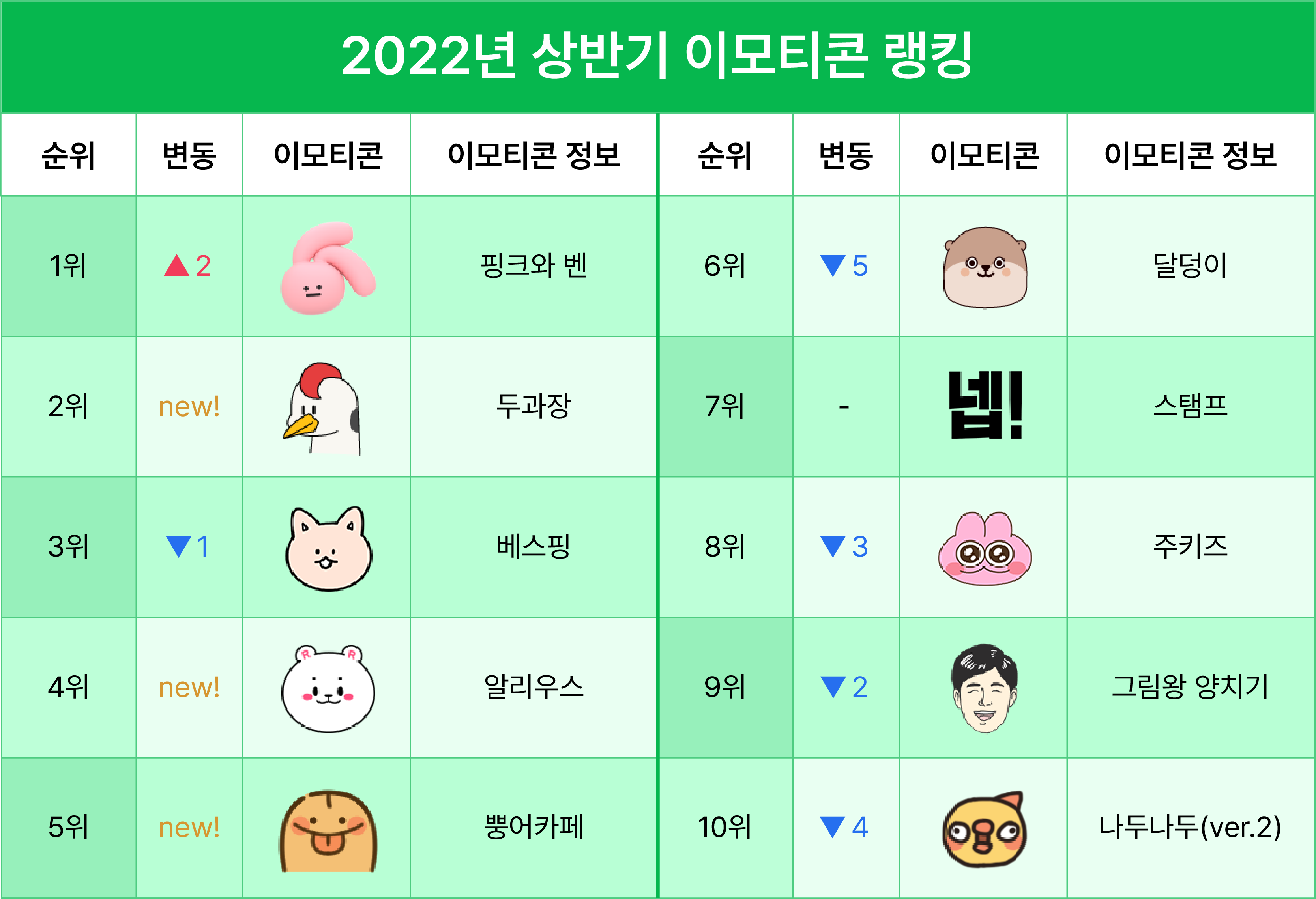 2022년 상반기, 전체적인 이모티콘 세트의 사용량을 봤을 때 인상적인 부분은 바로 잔디 유저들의 경우 확실히 새롭게 추가된 이모티콘들을 많이 사용하는 경향을 보인다는 점입니다. 상반기에 추가된 ‘두과장’, ‘뿡어카페’, ‘알리우스’ 모두 신규 이모티콘이지만 전체 세트 중 다섯 손가락에 드는 사용량을 보였고, 이 중 알리우스는 ‘감사합니다’가 엄청나게 사용되며 나온 지 2개월 만에 종합 4위에 등극했습니다. 종합 1위를 차지한 ‘핑크와 벤’도 2021년 10월 추가되어 신규 이모티콘으로 분류할 수 있는데, 특유의 귀여움으로 꾸준하게 사랑받았습니다.