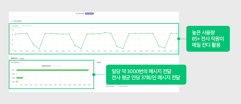 GC지놈의 잔디 관리자 대시보드에서는 구성원들이 잔디 위에서 얼마나 활발하게 소통하고 있는지 확인할 수 있습니다. 하루 평균 약 3000번의 메시지, 1인당 37회의 메시지를 주고받으며 구성원 간 협업이 이루어지고 있습니다. 이는 조직의 통합된 소통 도구로 잔디가 뿌리 깊게 자리 잡은 것을 나타내지요.