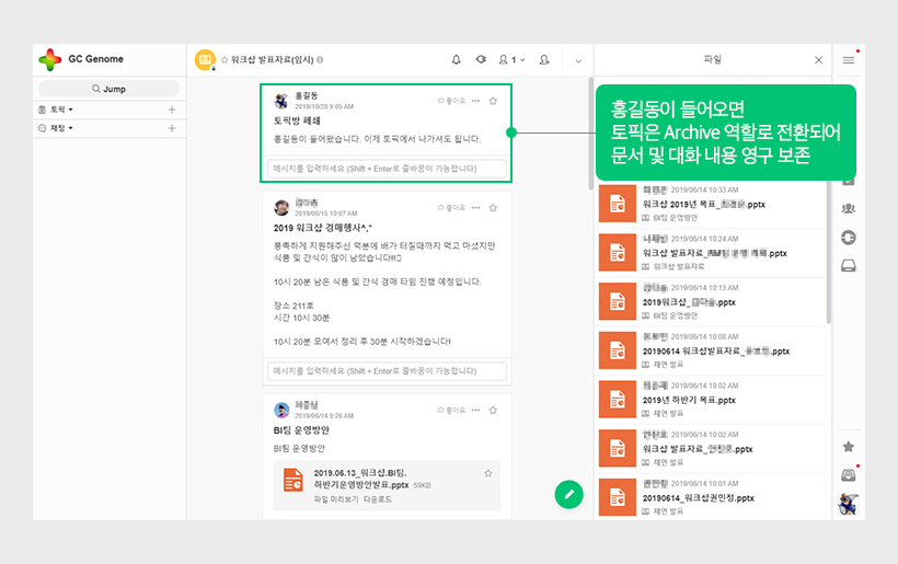 잔디가 주요 소통채널로 자리 잡으면서 자연스럽게 토픽과 채팅방이 많아집니다. 더 이상 사용하지 않는 토픽이나 채팅방을 정리하고 싶은데 자료는 보관하고 싶을 경우 ‘홍길동’을 초대합니다. ‘홍길동’은 가상의 직원입니다. ‘홍길동’이 들어오면 토픽에 있는 구성원은 모두 해당 토픽방에서 나간다는 무언의 약속이 있습니다. 구성원들은 모두 나가지만 대화, 문서를 포함한 정보들은 사라지지 않고 홍길동의 수호아래 Archive 형태로 남아있는 것이지요.