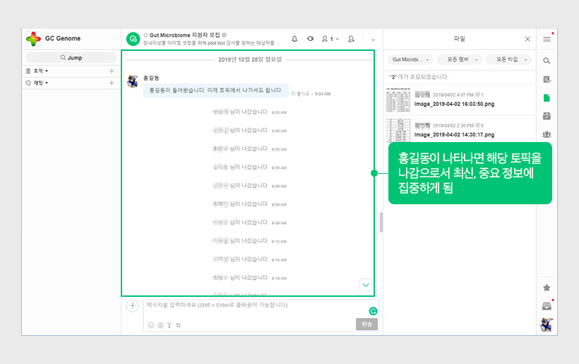 GC지놈은 젊은 조직입니다. 평균 임직원 나이 30대로 젊은 구성원들이 많고 우리 회사가 첫 직장인 열정이 가득하고 에너지가 넘치는 구성원으로 이루어져 있습니다. 따라서 젊은 세대가 선호하는 빠른 소통채널이 필요했습니다.