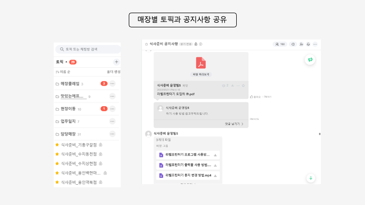 식사준비의 150개 이상의 매장은 5명의 수퍼바이저가 나눠서 관리하고 있기 때문에 효율적인 소통과 기록이 매우 중요합니다. 따라서 매장별 토픽에서 일상적으로 발생하는 매장 대소사에 대한 모든 내용을 기록하고 있습니다. 생각보다 정말 다양한 소통이 이뤄지고 있습니다. 전단지 디자인 요청, 고객 클레임 처리 방법, 매장 전구 교체, 발주를 놓친 경우 도움 요청을 하시기도 합니다. 관련해 본사 다른 팀에 공유가 필요한 경우에는 담당자를 멘션해 도움을 요청합니다.