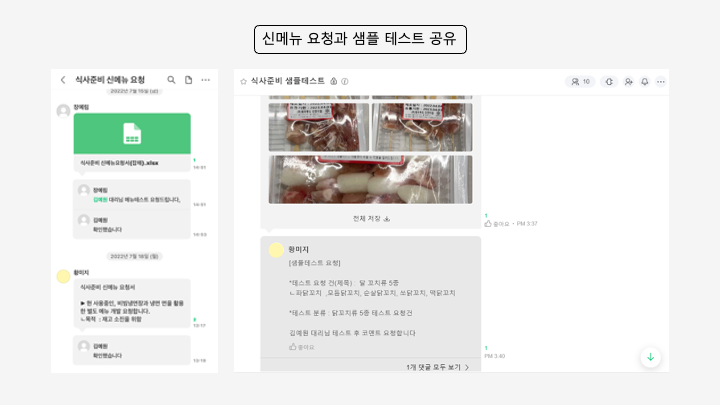 밀키트 시장 경쟁이 치열해지면서 식사준비는 더 다양하고 맛있는 밀키트를 개발하기 위해 노력하고 있습니다. 그 일환으로 ‘샘플 테스트’ 토픽을 운영하고 있는데요. 현장에서 고객을 직접 마주하는 점주님들께서 많은 아이디어와 의견을 주시는데요. 샘플테스트 토픽에 의견을 공유하면 메뉴 개발팀에서 해당 메뉴를 테스트하고 구매팀과 실제로 출시가 가능한 메뉴일지 협의합니다. 그 이후에 구체적인 생산계획을 수립해 직영점에서 테스트 판매 후 몇 가지 개선 사항을 공유하고 수정한 뒤 전국 매장에 출시가 됩니다. 최근 샘플 테스트 과정을 거쳐 소고기뭇국, 설렁탕 HMR(Home Meal Replacement) 신메뉴가 출시되었는데 전국 매장에서 3일간 약 2,000개의 판매량을 보이면서 좋은 반응을 얻기도 했습니다.