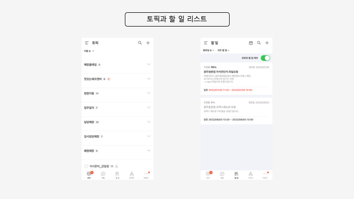 맛있는F&B가 잔디를 처음 사용할 때만 해도 배부장찌개 단일 브랜드만 운영하고 있었는데요. 추가로 식사준비 론칭을 준비하면서 잔디의 진가가 발휘되었습니다. 먼저 신규 브랜드 론칭 준비를 위한 토픽을 만들어 기획, 운영, 재정, 디자인 팀 등 유관 구성원을 초대합니다. 공지 사항과 요청 자료를 실시간으로 공유하기 때문에 소통 때문에 지체되는 시간 없이 빠르게 업무를 진행했습니다. 특히 담당자와 일정을 지정하고 진행률이 공유되는 할 일 기능을 활용해 순조롭게 론칭을 할 수 있었습니다.
