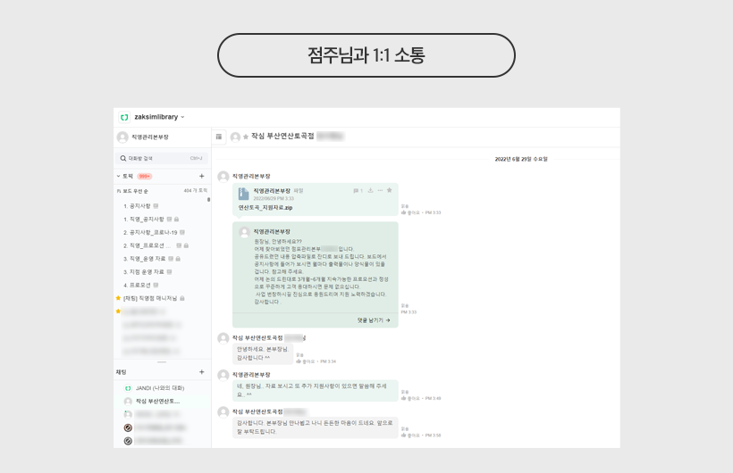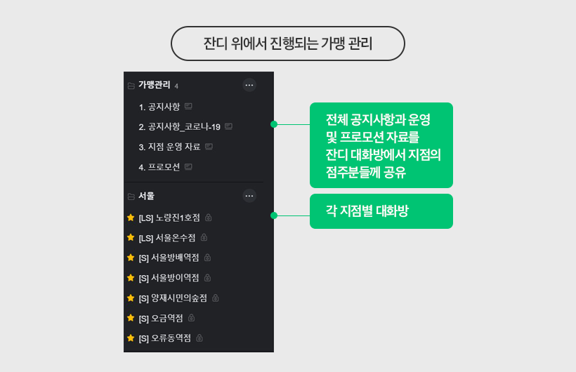 예를 들어, 이전에는 중요한 공지 내용을 점주님들이 확인했는지 파악하기 위해 기존에는 한 분 한 분께 메시지를 보내고 전화를 걸어야만 했습니다. 그러나 아무래도 다들 각 매장에서 업무가 바쁘시다보니 한번에 전화 연결이 어려웠고 자연히 온종일 전화를 붙잡고 있는 일이 많았습니다. 그런데 이제는 잔디에 공지사항, 지점 운영자료, 프로모션 등 꼭 필요한 내용을 주제별로 담을 수 있는 대화방을 ‘읽기 전용’으로 구성해서 중요한 내용을 전달하고, 필요할 때는 각 지점에 준회원으로 초대한 점주님들과 1:1로 추가 소통을 하고 있습니다.