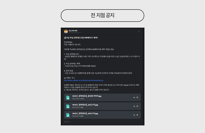 저희 아이엔지스토리에서 생각하는 잔디의 가장 큰 장점은 정회원, 준회원 권한 설정이 가능하다는 것입니다. 앞에서 언급했듯 저희는 공지방과 지점별 대화방 등 여러 대화방을 생성하고 있는데, 권한 설정 덕분에 토픽의 목적에 부합하는 소통방식을 정할 수 있었습니다. 예를 들어, 전사 소식을 공유하거나 마케팅에 활용할 수 있는 템플릿을 공유하는 방에서는 정회원인 본사 구성원들만 게시글/댓글을 작성할 수 있고, 준회원으로 초대된 점주님들은 읽는 것만 가능하기 때문에 정보를 공유하는 목적에만 오롯이 집중할 수 있습니다. 소통 방식을 본사에서 구상한 대로 짤 수 있다는 점이 가장 매력적이었다고 할 수 있겠습니다.