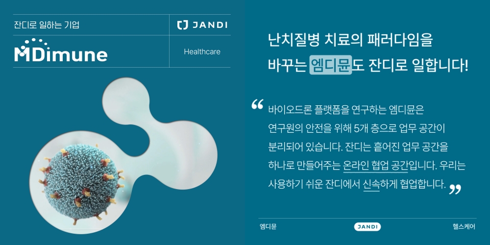 엠디뮨은 업무공간이 5개 층으로 나뉘어 있고, 연구원의 안전을 위해 연구공간과 사무공간을 분리하고 있습니다. 오프라인 업무 공간이 흩어져 있다보니, 소통을 통합해줄 온라인 협업 공간이 필요해 잔디를 도입하게 되었습니다.