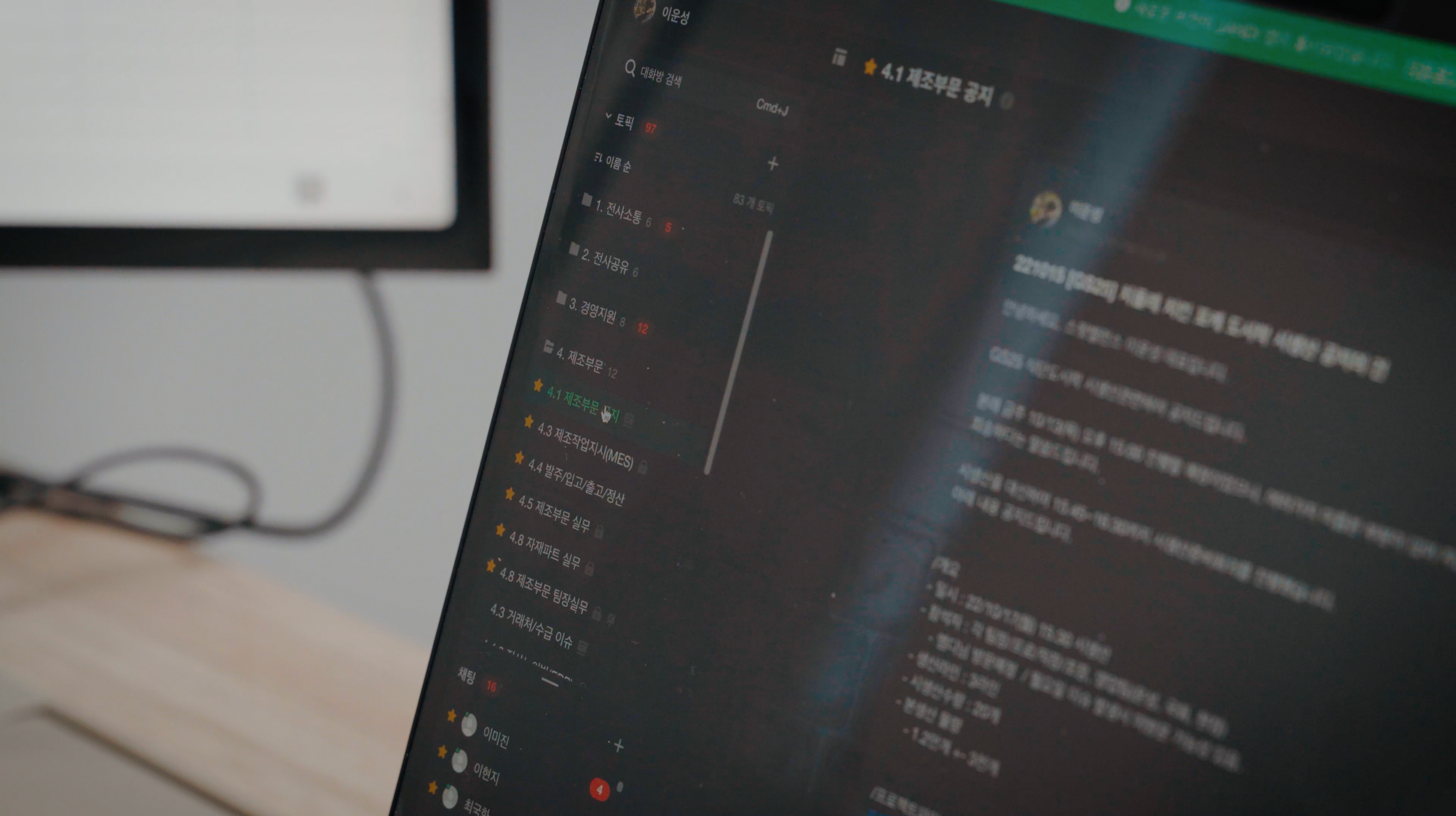 스윗밸런스의 모든 제품 생산을 책임지고 있는 생산팀은 타 부서와의 소통이 제일 중요합니다. 생산팀 내의 제조 부문만 11개의 토픽을 사용할 정도로 많은 양의 정보 공유와 소통이 이루어지고 있는데요. 영업 관리팀과의 전용 토픽을 통해 생산의 예측 및 작업지시의 정확성을 높이고, 품질팀과 RM(Risk Management)팀의 소통을 통해 고객으로부터 인입된 클레임이나 컴플레인을 공유해 보다 수준 높은 품질을 제공하고 개선점을 찾고 있습니다.