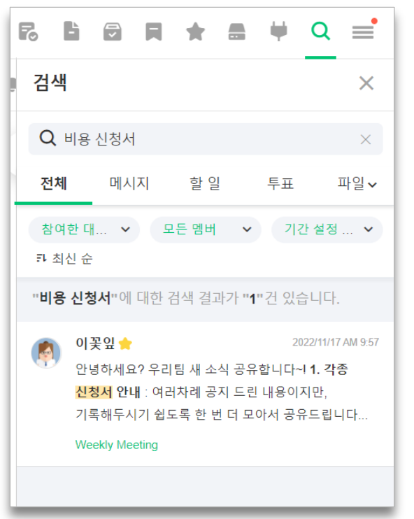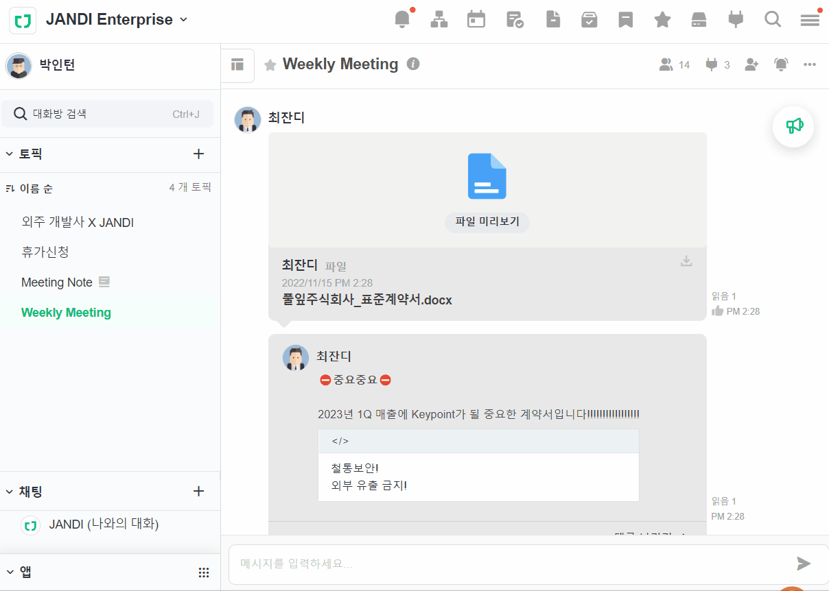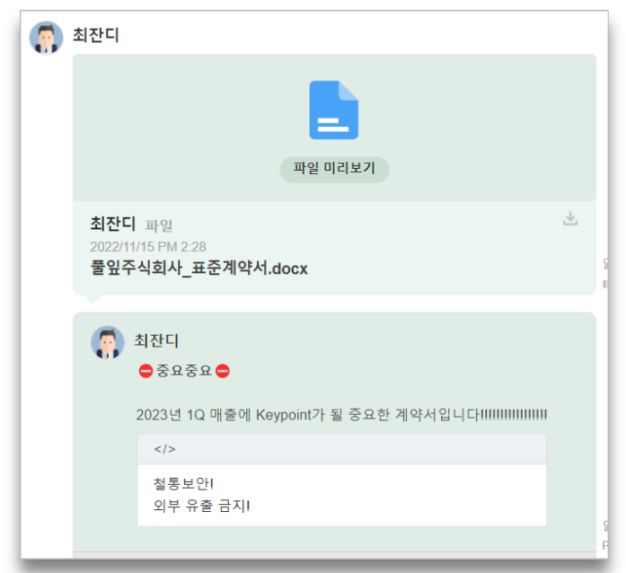 - 초대받은 대화방의 자료만 확인할 수 있기 때문에 업무 보안 유지에 도움이 됩니다. (초대 이전의 대화방 내용은 확인 가능)