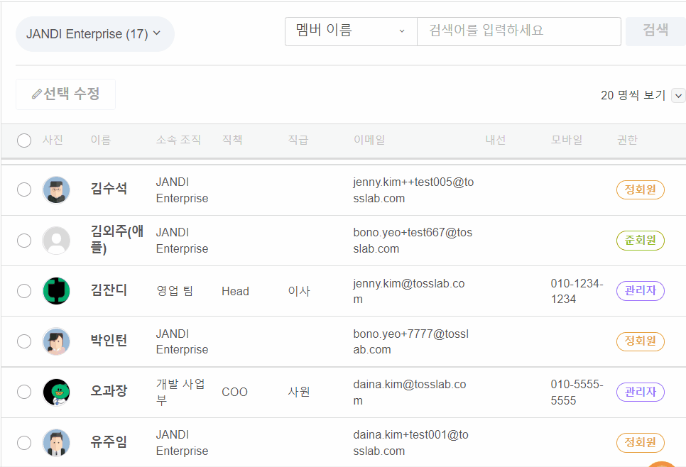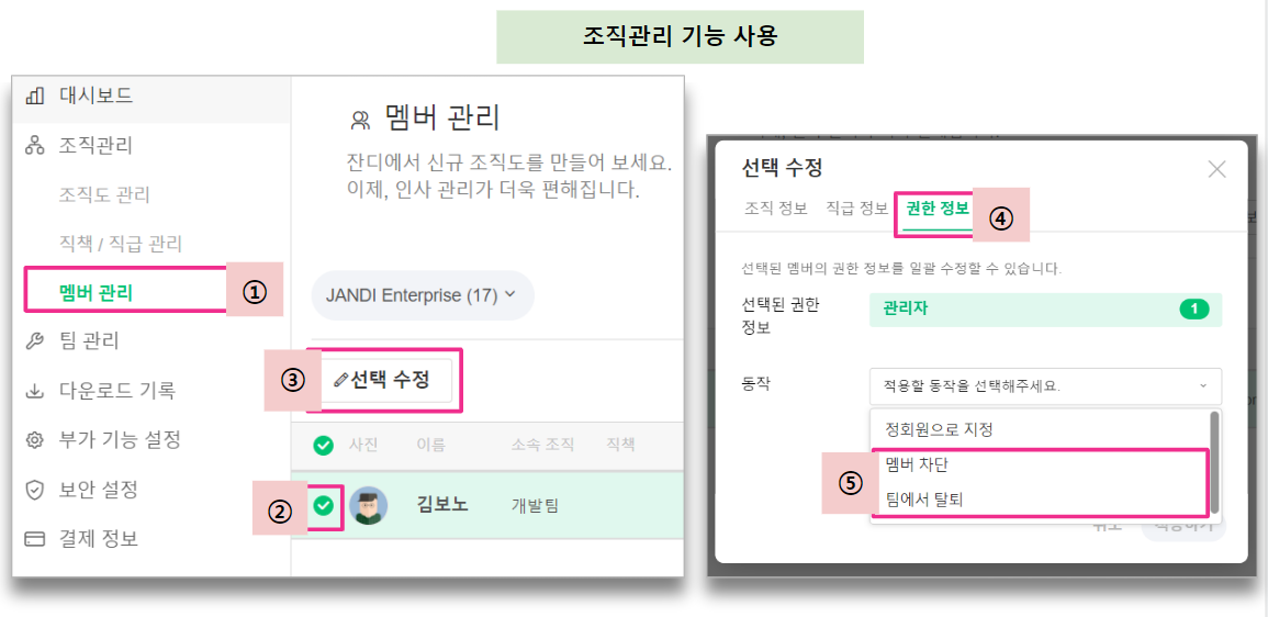 - 조직관리 기능 사용 : 잔디(PC) 우측 상단[=] > 관리자 메뉴 > 조직관리 > 멤버 관리 > 권한 정보