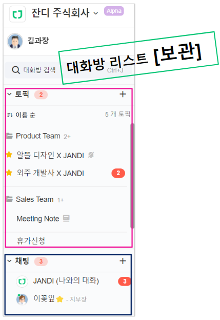* 차단(휴직) 예정인 멤버가 직접 본인이 참여 중인 토픽리스트, 폴더 구성, 그룹 채팅 목록을 미리 캡처해놓으면 차단 해제 후에 손쉽게 대화방을 찾을 수 있습니다.