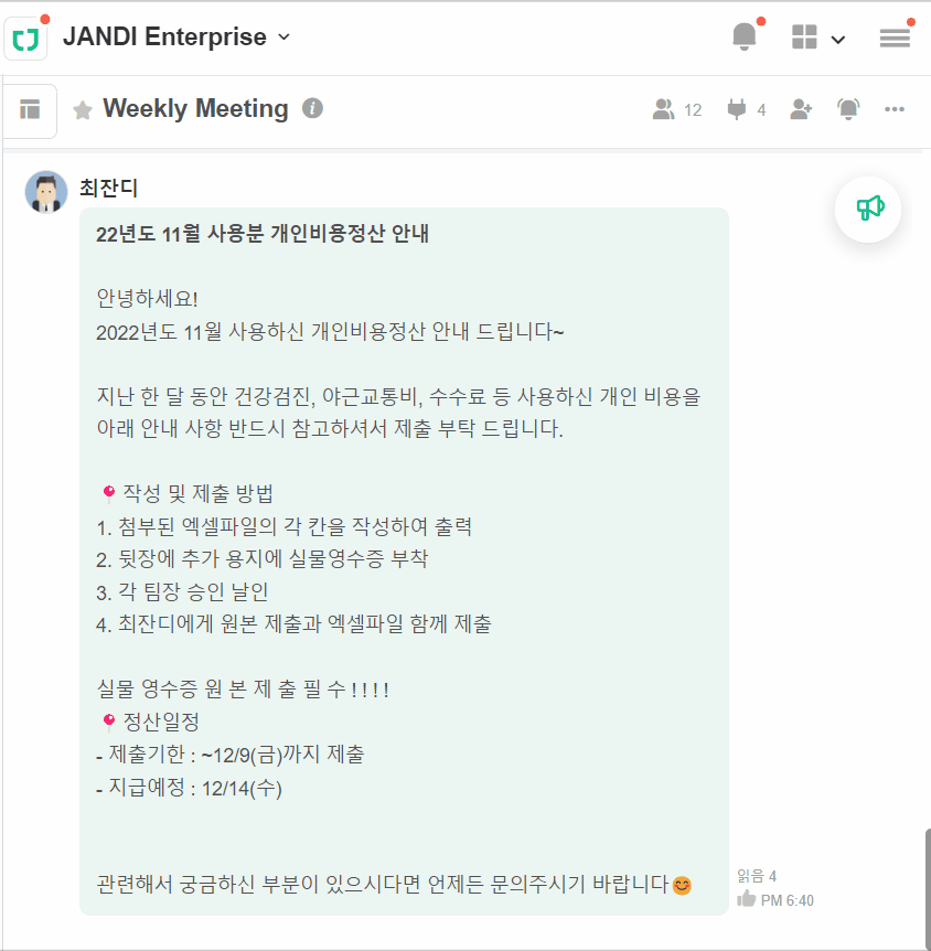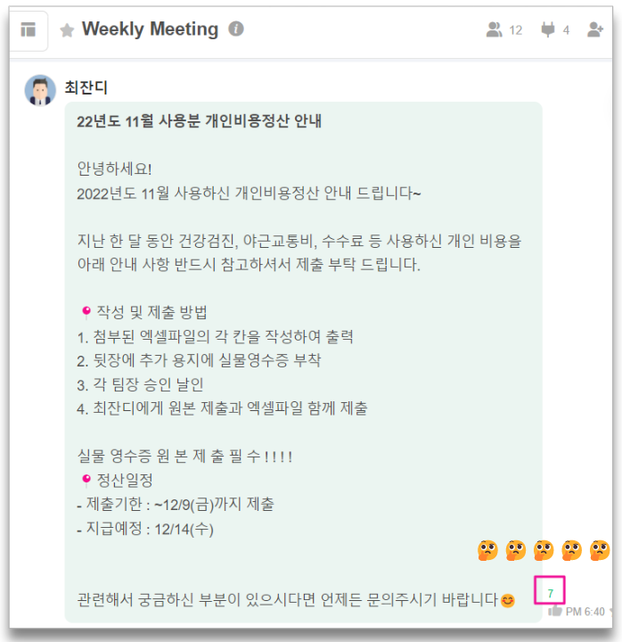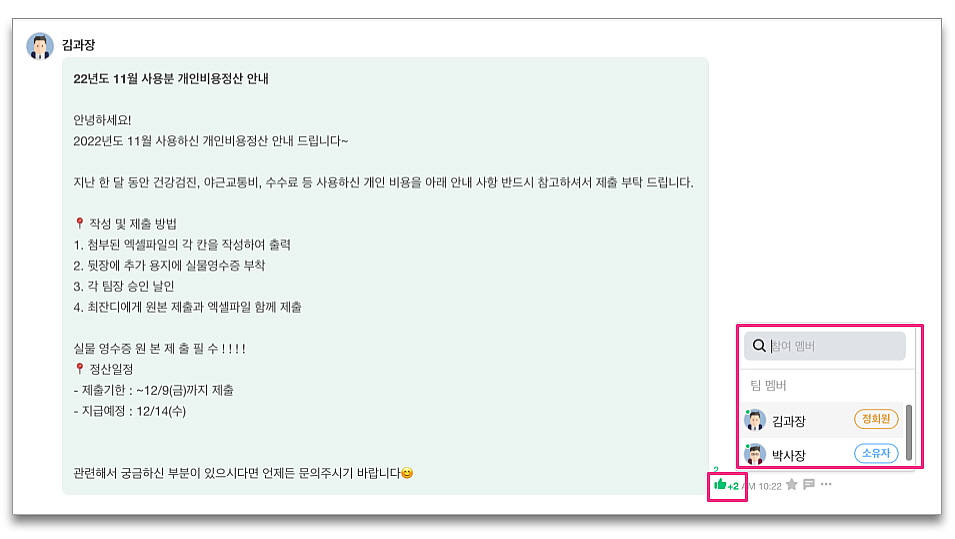 수신된 멤버를 카운트하여 표시되기 때문에 업무 요청 시 진행 상황이 모두에게 잘 전달됐는지 파악하기 유용합니다.