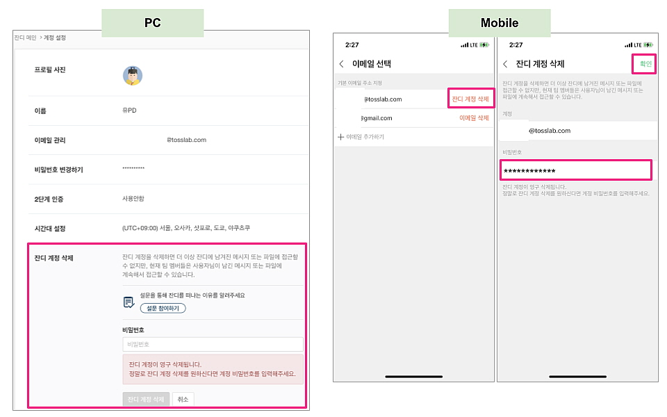 - Mobile : 하단 더보기 […] > 우측 상단 설정 > 기본 이메일 주소 > 잔디 계정 삭제