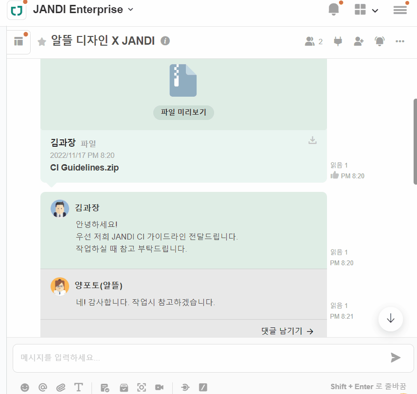 잔디에서는 비공개 토픽이나 채팅이 있고, 각 프로필에 따라 메시지와 파일을 전송한 멤버가 표시되기 때문에, 위와 같은 방법을 추천드리지 않습니다.