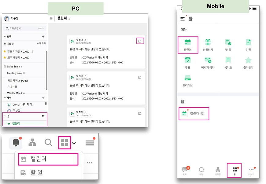 - PC : 캘린더 앱 메시지로 접속하거나 상단 툴 메뉴를 통해 접속할 수 있습니다.