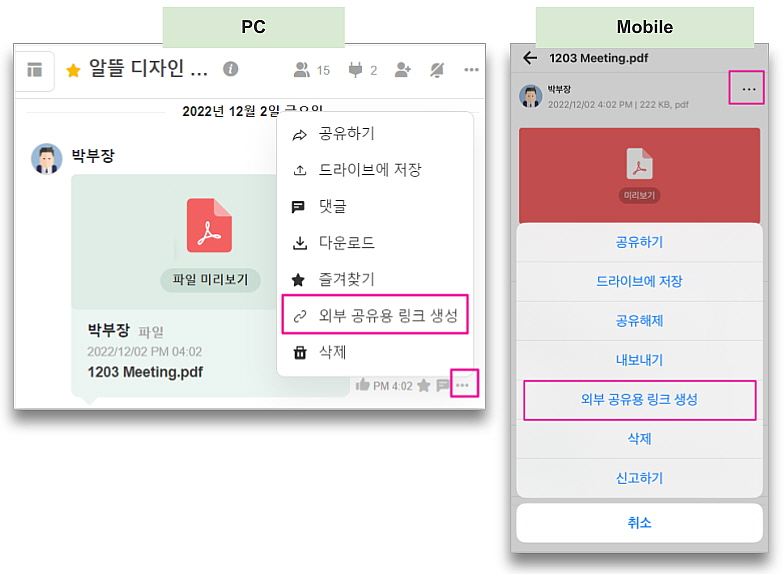 - Mobile : 파일 상세 보기 페이지에서 […] 더 보기 > [외부 공유용 링크 생성]