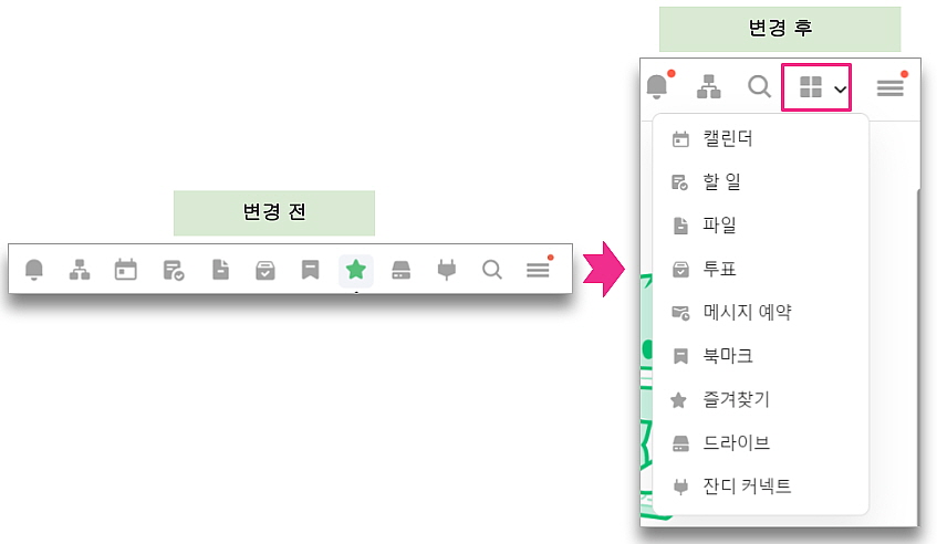 더욱 심플해진 UI로 가시성을 높였고, 데이터를 통해 많은 유저분들이 이용하시는 알림센터 / 조직도 / 검색 아이콘만 따로 위치하여서 사용성을 높였습니다.
