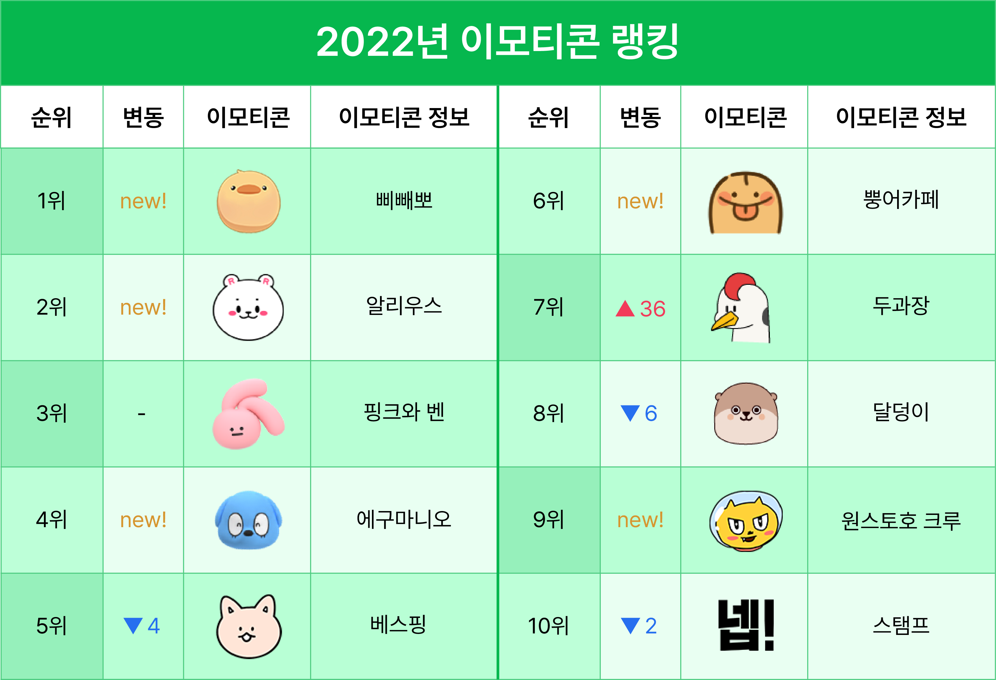 2022년 세트 랭킹 1위를 차지한 삐빼뽀는 특유의 몽글몽글하고 귀여운 감정 표현과 발랄한 움직임으로 큰 사랑을 받았습니다. 삐빼뽀 세트 중 특정 이모티콘이 유독 큰 사랑을 받기보다는 이모티콘 세트 전반적으로 두루두루 많이 사용되어 세트 1위를 달성했습니다. 반면, 근소한 차이로 2위에 등극한 알리우스는 ‘감사합니다’ 감정표현 이모티콘이 개별 이모티콘 중에서 압도적으로 많이 사용되며 세트 순위를 끌어 올렸습니다. 삐빼뽀와 알리우스처럼 2022년에 추가된 신규 이모티콘 6종 중 5종이 Top 10에 들어왔는데요, 핑크와 벤의 경우 2021년 10월 잔디에 추가되고도 전체 3위라는 엄청난 기록을 세웠고 그 후 2022년에도 꾸준한 사랑을 받아 3위 자리를 수성할 수 있었습니다. 7위를 차지한 두과장의 경우 2021년 12월에 추가되어 아무래도 21년에는 낮은 순위에 있을 수밖에 없었는데, 2022년에는 다행히 10위 안에 안착했습니다.