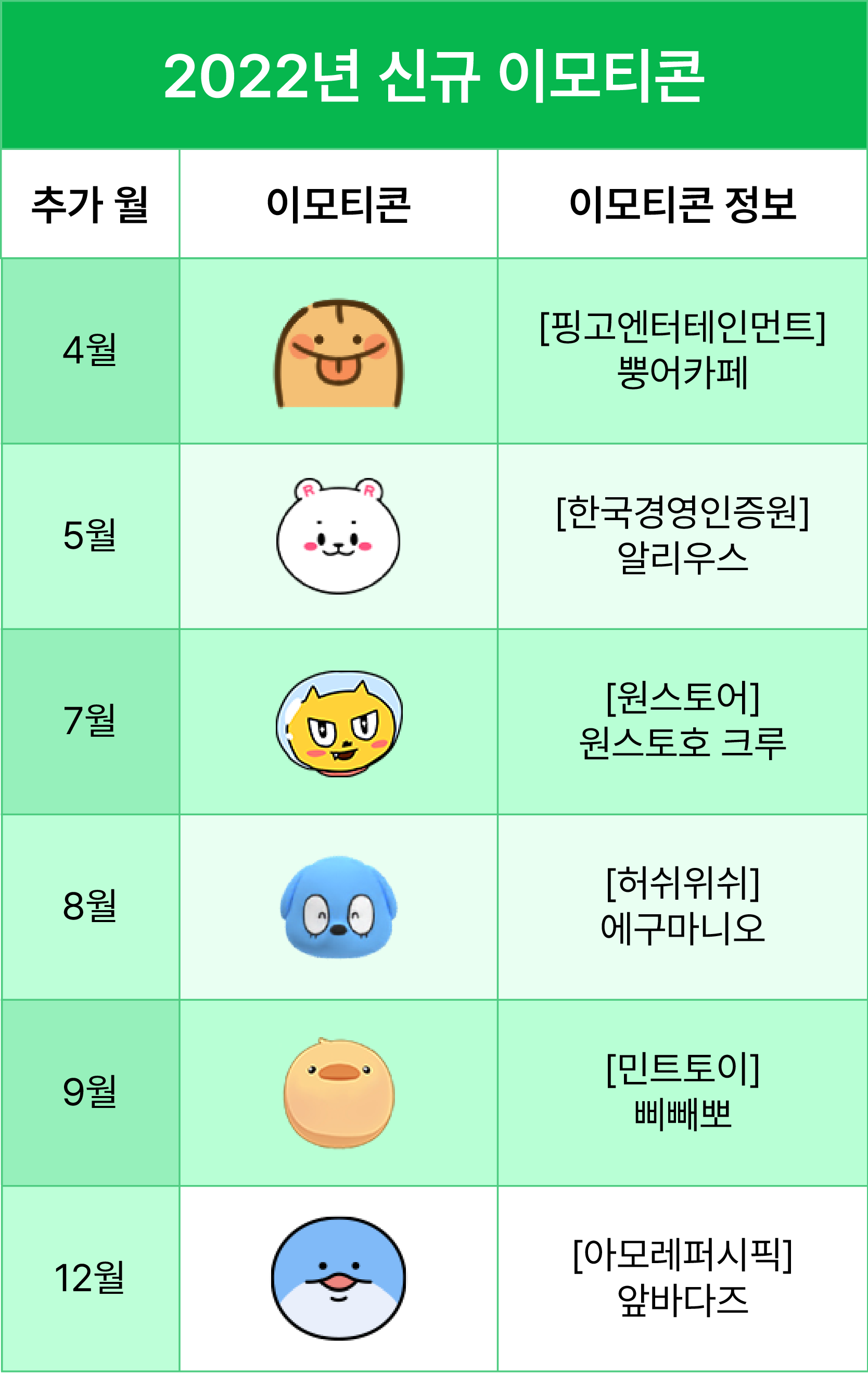 2022년에는 잔디에 새로운 업무용 이모티콘 총 6종이 추가되었습니다. 핑고엔터테인먼트의 ‘뿡어카페’가 4월, ‘한국경영인증원’의 알리우스가 5월, ‘원스토어’의 원스토호 크루가 7월, ‘허쉬위시’의 에구마니오가 8월, ‘민트토이’의 삐빼뽀가 9월 추가되어 이모티콘 세트 부분 사용량 Top 10에 안착했고, 지난 12월 말 ‘아모레퍼시픽’의 앞바다즈가 추가되어 큰 사랑을 받고 있습니다.