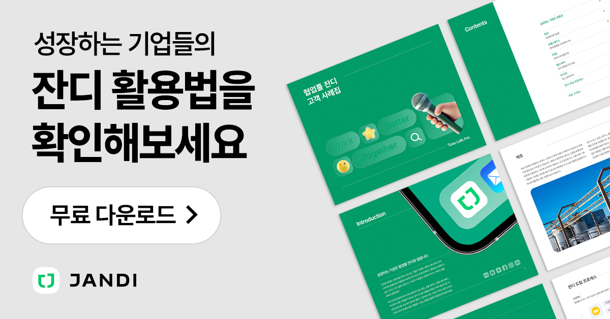 이번 사례집을 읽고 우리 회사도 협업툴 잔디를 도입해야겠다는 생각이 드셨나요? 하단 배너를 통해 도입 문의를 남겨 주세요. 35만 팀에 잔디를 정착시킨 노하우를 가진 산업별 협업툴 전문가가 우리 조직에 꼭 맞는 활용법과 플랜을 함께 고민하고 컨설팅해 드립니다.