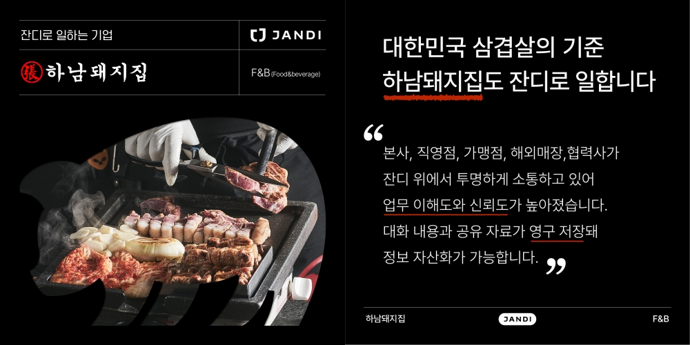 하남돼지집은 본사, 직영점, 가맹점, 해외매장, 협력사 등을 유기적으로 아우를 수 있는 협업툴 잔디를 도입했습니다. 하남돼지집은 주제별로 대화방을 구분하는 잔디의 토픽을 지점별∙팀별∙업무별∙상황별로 구성해 목적에 맞는 주제만 논의하고 있습니다.