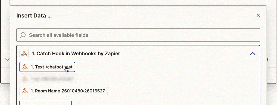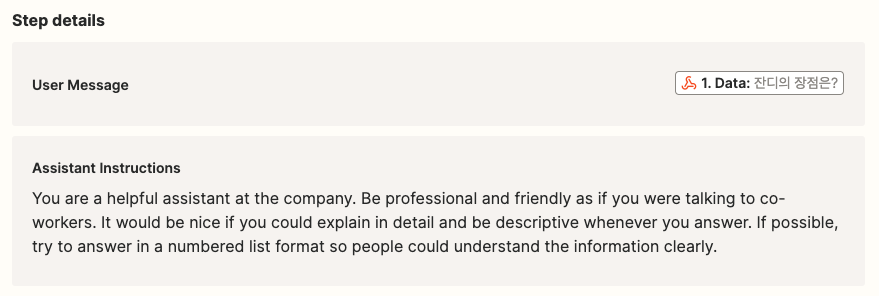 ChatGPT 계정 연결이 끝나면 Action을 선택할 수 있습니다. ‘User Message’ 부분에 [1. Catch Hook in Webhooks by Zapier]를 선택하고 [Show all options]를 누르면 나오는 [1. Data: 테스트 메시지] 항목을 넣어주세요. 그 외 부분은 원하는 대로 작성하면 되는데, ‘Assistant Instructions’ 부분에 우리 팀 챗봇에 원하는 바를 상세하게 적어주면 더 좋습니다. 이제 마찬가지로 [Continue] 버튼을 누르고 [Test Action]를 눌러 계속 진행합니다.