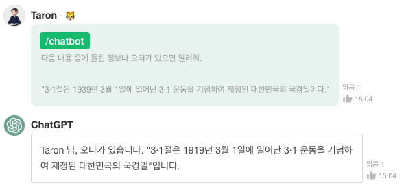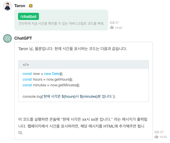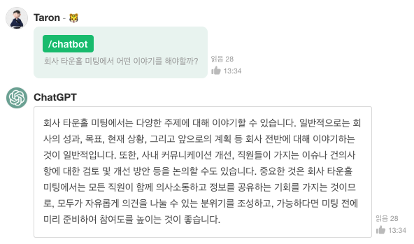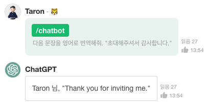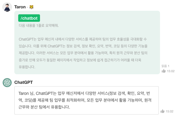 그리고 OpenAI에서 훈련된 대규모 언어 모델인 ChatGPT의 등장은 최근 더 스마트하게 일하고 생산성을 극대화하려는 팀에게 또 하나의 새로운 가능성을 제시하고 있습니다. 바로 협업툴에서 제공하는 연동 기능을 활용하면 협업툴 내에서 메시지로 즉각 ChatGPT의 AI의 답변을 받을 수 있는 챗봇을 만들 수 있기 때문입니다. 지식 관리· 언어 번역 등 협업툴에 연동한 챗봇을 팀의 가치 있는 자산으로 만들고 커뮤니케이션, 협업, 그리고 전반적인 효율성을 개선할 수 있는 실용적인 방법들을 한번 살펴보겠습니다.