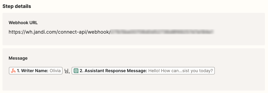 이제 다시 재피어로 돌아가 하단에 [+] 버튼을 눌러 액션을 하나 더 생성해주세요. 검색창에 ‘JANDI’를 검색해 추가하고, 이벤트로 ‘Send Incoming Webhook’을 선택해줍니다. 하단 Account 부분에서 잔디 계정을 연동하시고요, Action만 설정하면 연동이 드디어 끝납니다. ‘Webhook URL’ 부분에 아까 복사해둔 ‘Webhook 수신’ 주소를 붙여넣어주세요. ‘Message’ 부분에는 [2. Conversation in ChatGPT]에 들어가 [Show all options]를 누른 뒤 [2. Assistant Response Message: 예시 메시지]를 선택해 넣어주세요. 그 외 내용도 자유롭게 입력하신 다음 마지막으로 테스트를 하고 [Publish Zap] 버튼을 누르면 모든 연동 과정이 끝납니다.