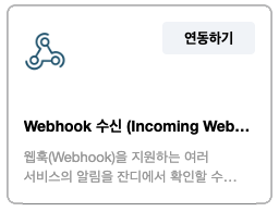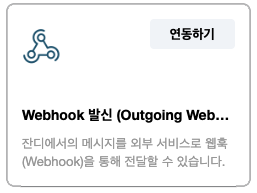 이제 잔디로 갈 때입니다. 잔디 대화방 상단의 콘센트 아이콘을 누르고 [연동 항목 추가하기] 버튼을 누른 뒤 ‘Webhook 발신(Outgoing Webhook)’의 [연동하기]를 눌러 웹훅을 생성합니다. 특정 토픽이 아니라 JANDI(나와의 대화)에 연동하려고 할 때는 잔디 유료 사용 팀의 관리자에게 제공되는 ‘팀 Webhook 발신’을 선택해 웹훅을 생성하면 됩니다.