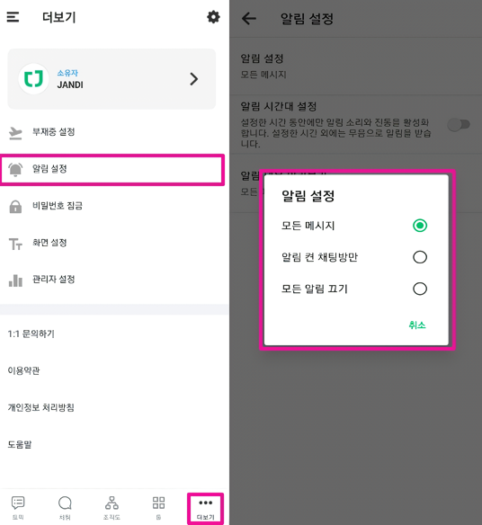 - 잔디 앱 화면 우측 하단 […] 더 보기 – [알림 설정] – [모든 메시지 / 알림 켠 채팅방만] 설정하면, PC를 사용 중이지 않을 때 모바일에서 메시지 확인이 가능합니다.