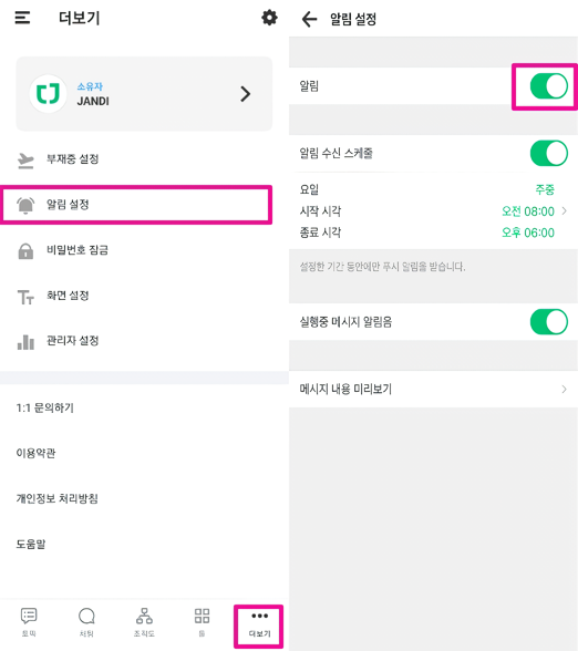 - 잔디 앱 화면 우측 하단 […] 더 보기 – [알림 설정] – [알림] ON 설정하면, PC를 사용 중이지 않을 때 모바일에서 메시지 확인이 가능합니다.