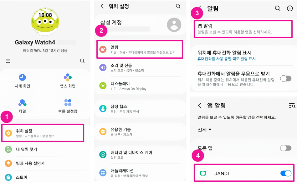 - Galaxy Wearable 앱에서 [워치 설정] – [알림] – [앱 알림] – [JANDI] 활성화