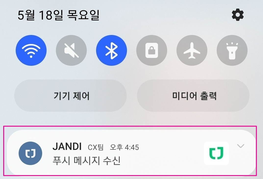 안드로이드의 경우 알림 [모든 알림 끄기] 또는 알림 설정 시간 외에도 휴대폰 상단의 ‘소리 및 진동이 없이’ 푸시 메시지가 수신됩니다.