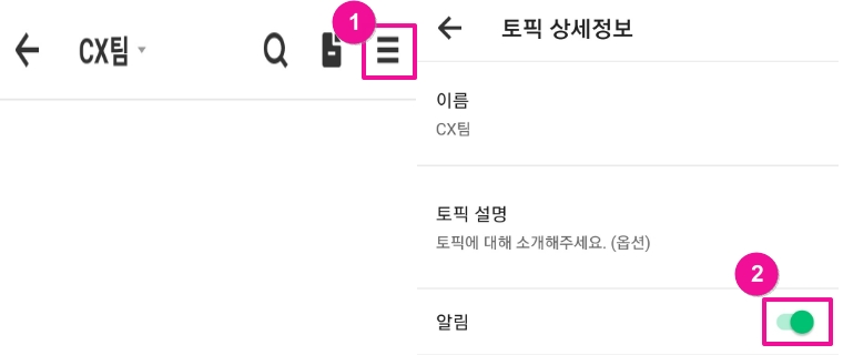 - 대화방 우측 상단 [≡] 클릭 – 알림 ON/OFF 설정을 해주세요.