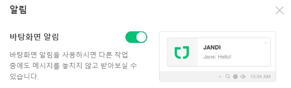 - PC/Web 화면 상단 [≡] – [알림] 메뉴에서 ‘바탕화면 알림’ ON으로 설정하면 푸시 알림 통해서 다른 작업 중에도 메시지 알림을 확인하실 수 있습니다.