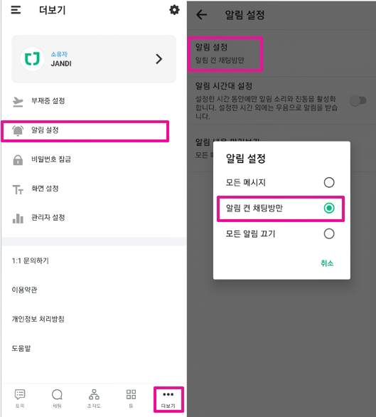 - 잔디 앱 우측 하단 […] 더 보기 – [알림 설정] – [알림 켠 채팅방만]으로 설정하시면 알림을 설정한 채팅방에서만 알림을 받을 수 있습니다.